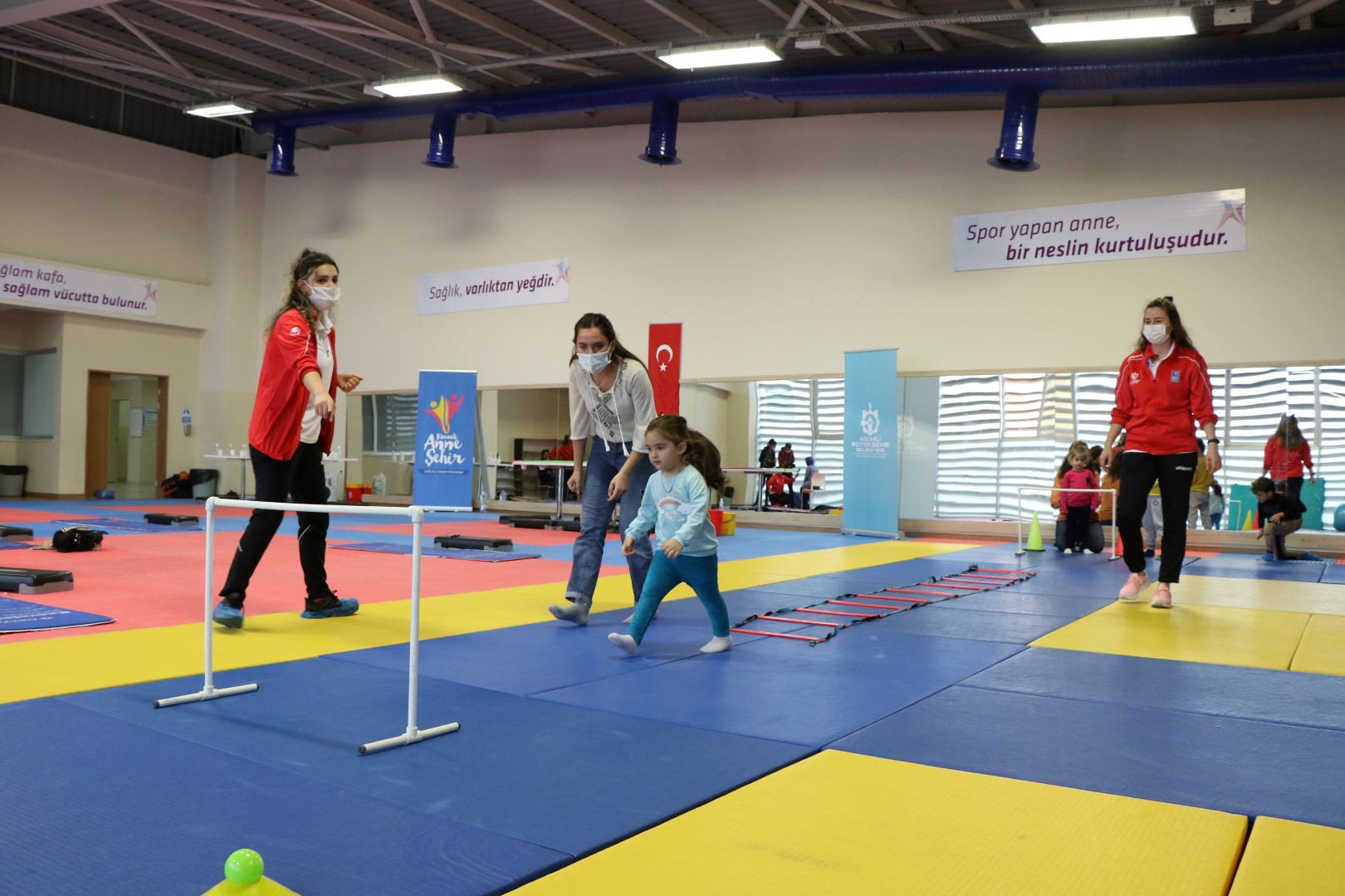 Müzik eşliğinde spor ve ısınma egzersizleri ile başlayan etkinlikler, çocukların anneleri ve akranları ile sosyal ilişkiler kurmasını da sağlıyor. Çocukların aynı zamanda fiziksel, ruhsal, bilişsel, duyuşsal, psikomotor gibi pek çok alanda gelişimlerine katkı sağlanıyor. Vücut esnetme, ısındırma hareketlerinin ardından aileler ve çocukların bir arada katılım sağladığı etkinlikler düzenleniyor. Çocukların sözcüklerle hareket arasında ilişki kurmalarını gerektiren becerikli parmak oyunları, müzik ve tekerleme eşliğinde çocukları harekete geçirici, refleks, el-göz koordinasyonu sağlayan patates adam oyunu, çeşitli materyallerle yapılan performans odaklı ritim oyunu, çocuklara sağlıklı nefesi öğretmeyi hedefleyen pinpon topu ile kontrollü nefes oyunu, çocuklara beden koordinasyonunu ve takım oyunlarına uyum sağlayıcı engelli parkur oyunu gibi etkinlikler yer alıyor.