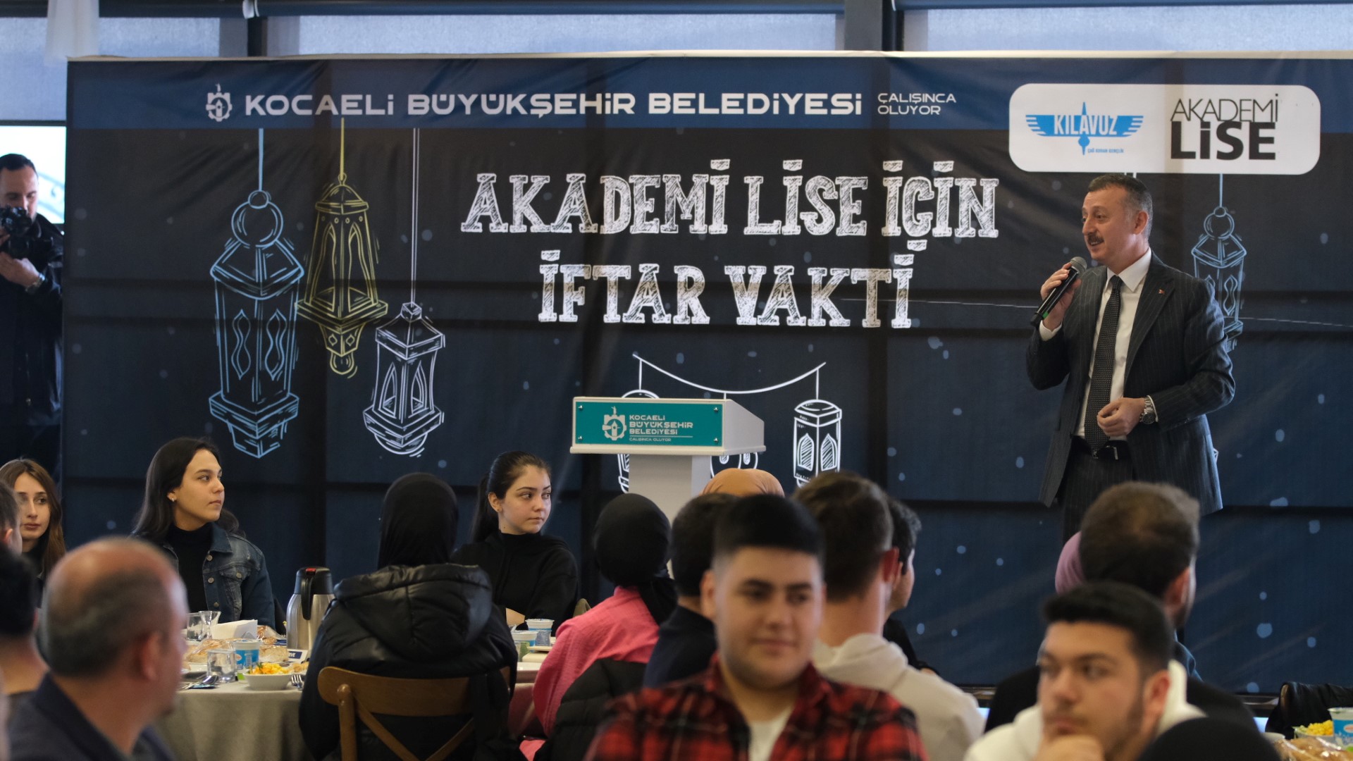 Kocaeli Büyükşehir Belediye Başkanı Doç. Dr. Tahir Büyükakın, Kılavuz Gençlik Akademi Liselerde üniversiteye hazırlanan öğrencilerle iftar programı öncesi bir araya geldi. Eğitime ve geleceğin teminatı olan öğrencilere her fırsatta sonsuz destek olan Başkan Büyükakın, iftar programında masaları tek tek dolaştı ve öğrencilerle sohbet etti. Türkiye’nin geleceğinin parlak olduğuna vurgu yapan Başkan Büyükakın, “Gençler, Türkiye’nin geleceğine inanın. Gençlere empoze edilen umutsuzluk kültürüne asla itibar etmeyin. Bunu her biriniz görecektir. Yeter ki Türkiye’yi seven, yerli, milli vatanına bağlı vatan evlatları bu memleketi sahiplensin” dedi.