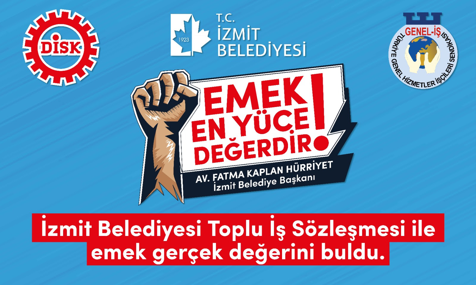 İzmit Belediye Başkanı Av. Fatma Kaplan Hürriyet işçiler arasındaki yıllardır süren adaletsizliği sonlandırıyor. İzmit Belediyesi ile DİSK Genel İş Sendikası arasında 15 Ekim’de başlayan görüşmeler işçilerin alın terinin karşılığını alacağı şekilde sonuçlandı. İşçinin hakkını koruyan, adaleti sağlamak adına sözleşme süresince titizlikle çalışan Başkan Hürriyet ve Genel İş Sendikası, 24 Şubat Çarşamba saat 12.30’da imzaları atacak.