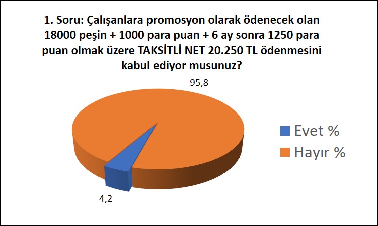 Hürriyetçi Eğitim Sen olarak düzenlediğimiz anketin 1. sorusu 3 Şubat 2023 tarihinde sonlanacak KOÜ Rektörlüğünün anket sorusu ile aynıdır. Amacımız Kocaeli Üniversitesi çalışanlarının promosyon olarak ödenecek olan 18.000 peşin + 1.000 para puan + 6 ay sonra 1.250 para puan olmak üzere TAKSİTLİ NET 20.250 TL ödenmesine ilişkin görüşlerini 3 Şubat 2023 tarihinden önce tespit etmektir.