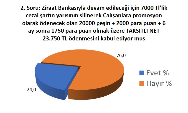 Anketimizin 2. sorusu, Ziraat Bankası’yla devam edileceği için 7.000 liralık cezai şartın yarısının silinerek çalışanlara promosyon olarak ödenecek olan 20.000 peşin + 2.000 para puan + 6 ay sonra 1.750 para puan olmak üzere TAKSİTLİ NET 23.750 TL ödenmesine ilişkin görüşlerini tespit etmek içindir. Zira Kocaeli Üniversitesi çalışanları, şartnameye onay veren yetkili sendikaların ve Bankayla cezai şart içeren sözleşme imzalayan eski üniversite yönetimin sorumluluğundan en fazla % 50 yükümlü tutulmalıdır.