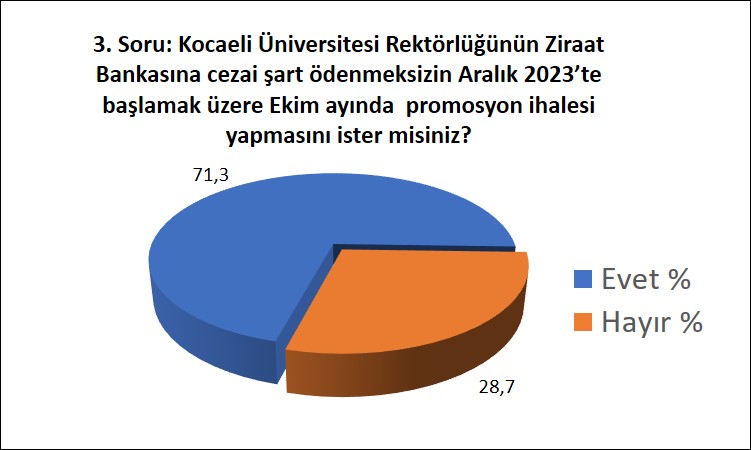 Anketimizin 3. sorusu, Kocaeli Üniversitesi Rektörlüğünün Ziraat Bankası’na cezai şart ödenmeksizin Aralık 2023’te başlamak üzere Ekim ayında promosyon ihalesi yapmasına ilişkin KOÜ Çalışanlarının görüşlerini tespit etmek içindir.