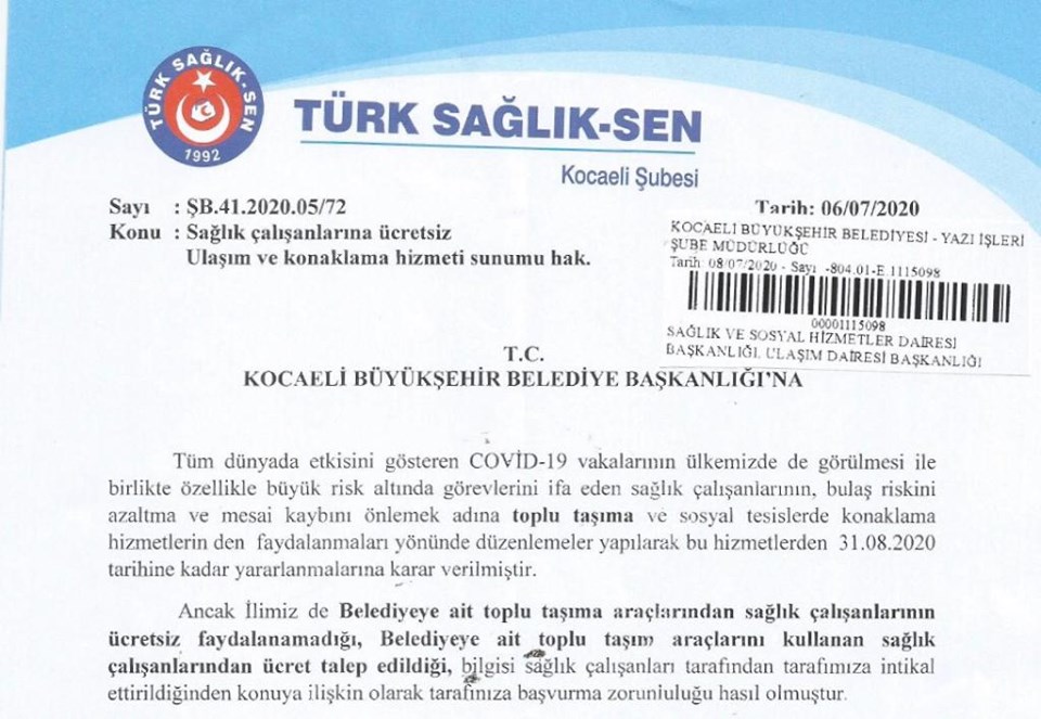 İlimizde görev yapan sağlık çalışanları Cumhurbaşkanlığı makamının verdiği kararın ilimizde de uygulanmasını istiyor. Bu yönde sağlık çalışanlarının Sendikamıza ilettiği yoğun bir talepleri vardır. Sağlık çalışanlarının sesi olarak bize iletmiş oldukları toplu taşıma araçlarından ücretsiz faydalanmak konusunu yazılı ve sözlü olarak Kocaeli Büyükşehir Belediyesine iletiyoruz.